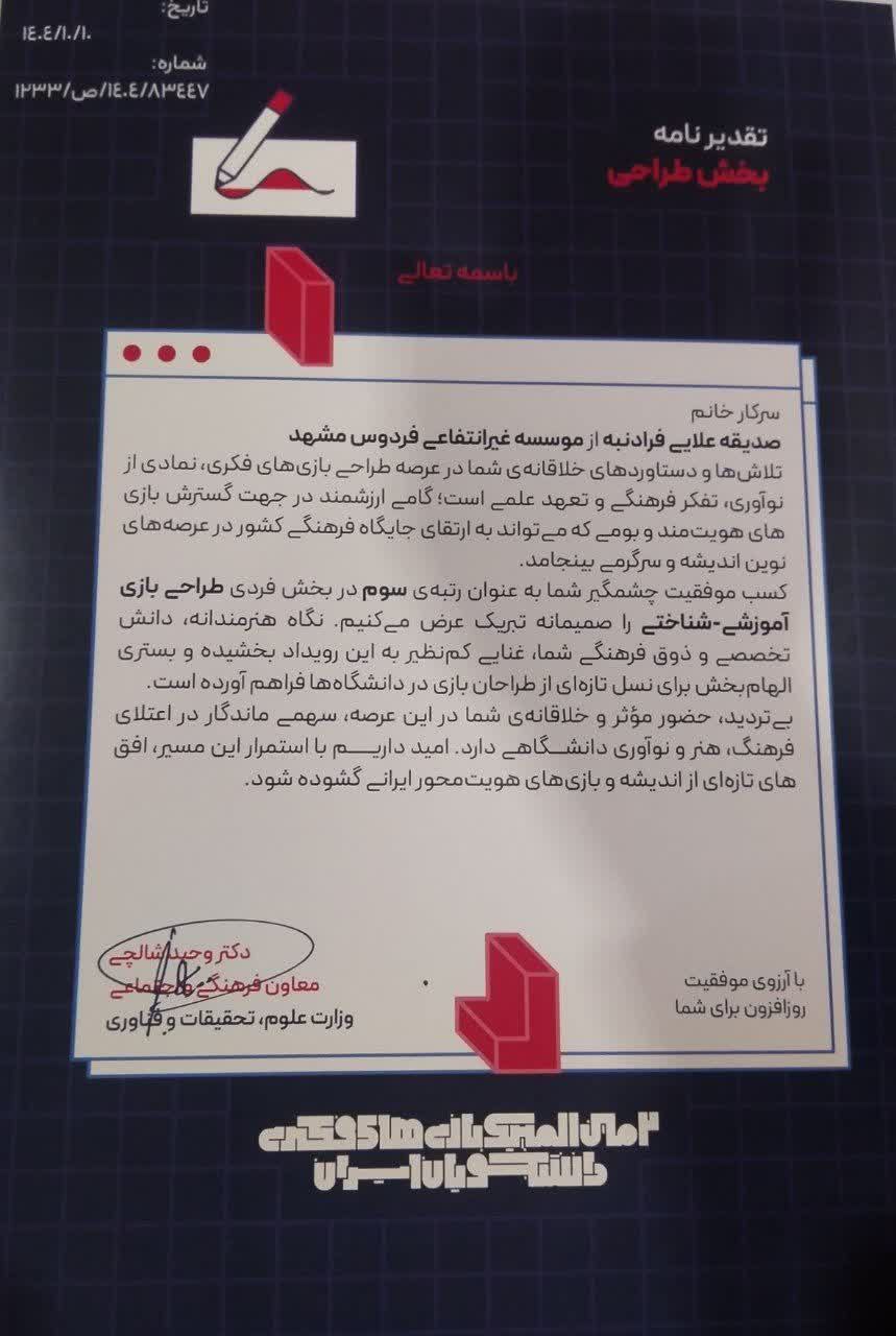 🏆 با کمال مسرت، کسب مقام سوم المپیک بازیهای فکری دانشجویان ایران در بخش فردی طراحی بازی آموزشی ـ شناختی توسط خانم صدیقه علایی، دانشجوی مقطع کارشناسی ارشد مؤسسه آموزش عالی فردوس را صمیمانه تبریک میگوییم.🎮